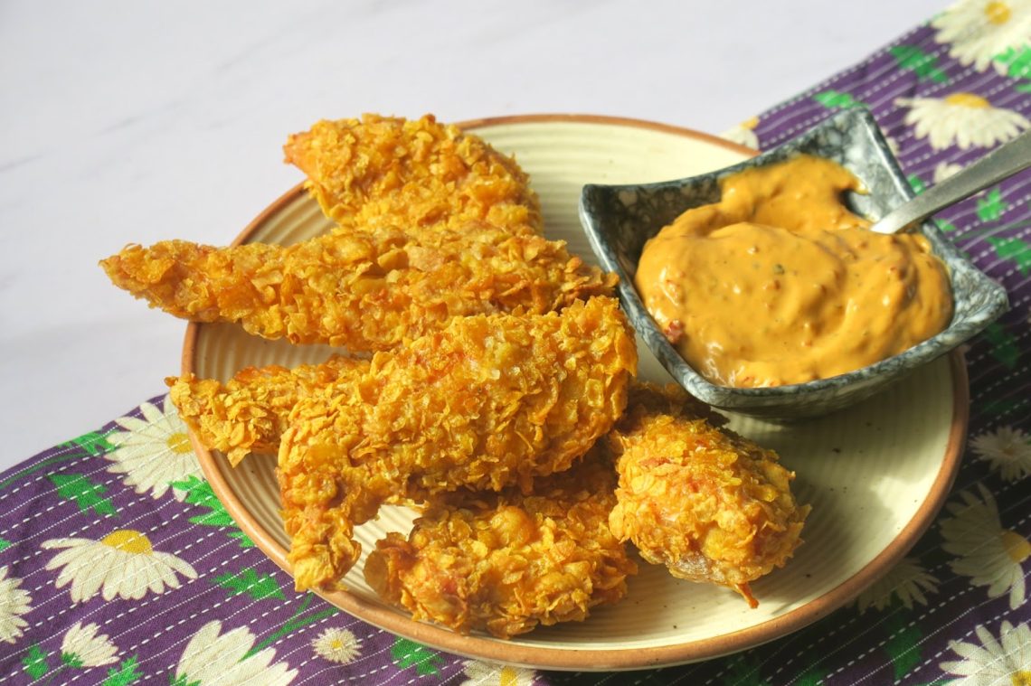 While breadcrumbs are the traditional choice, I like to use cornflakes for several reasons. They’re lighter and crunchier than breadcrumbs especially while air frying and retain their crispness with very little oil. Cornflakes also add a subtle sweetness that works brilliantly with the chicken. The sugar in the cornflakes also aids in the browning, giving you a perfectly golden strip.